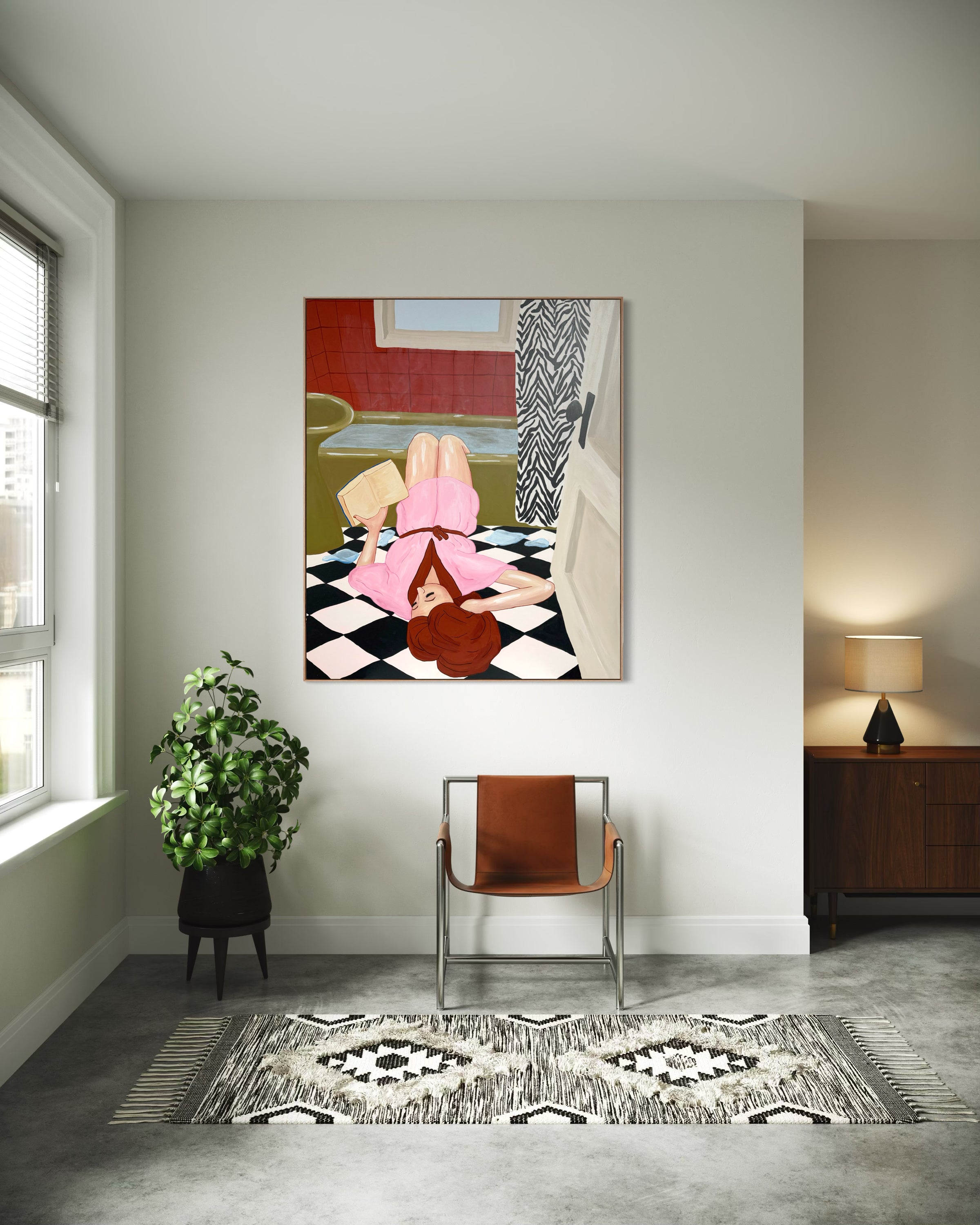 Em creates work for the female gaze, painting femme figures with agency, unapologetically resting, joyful, calm and in contemplation. Figures with straight backs and soft bellies.