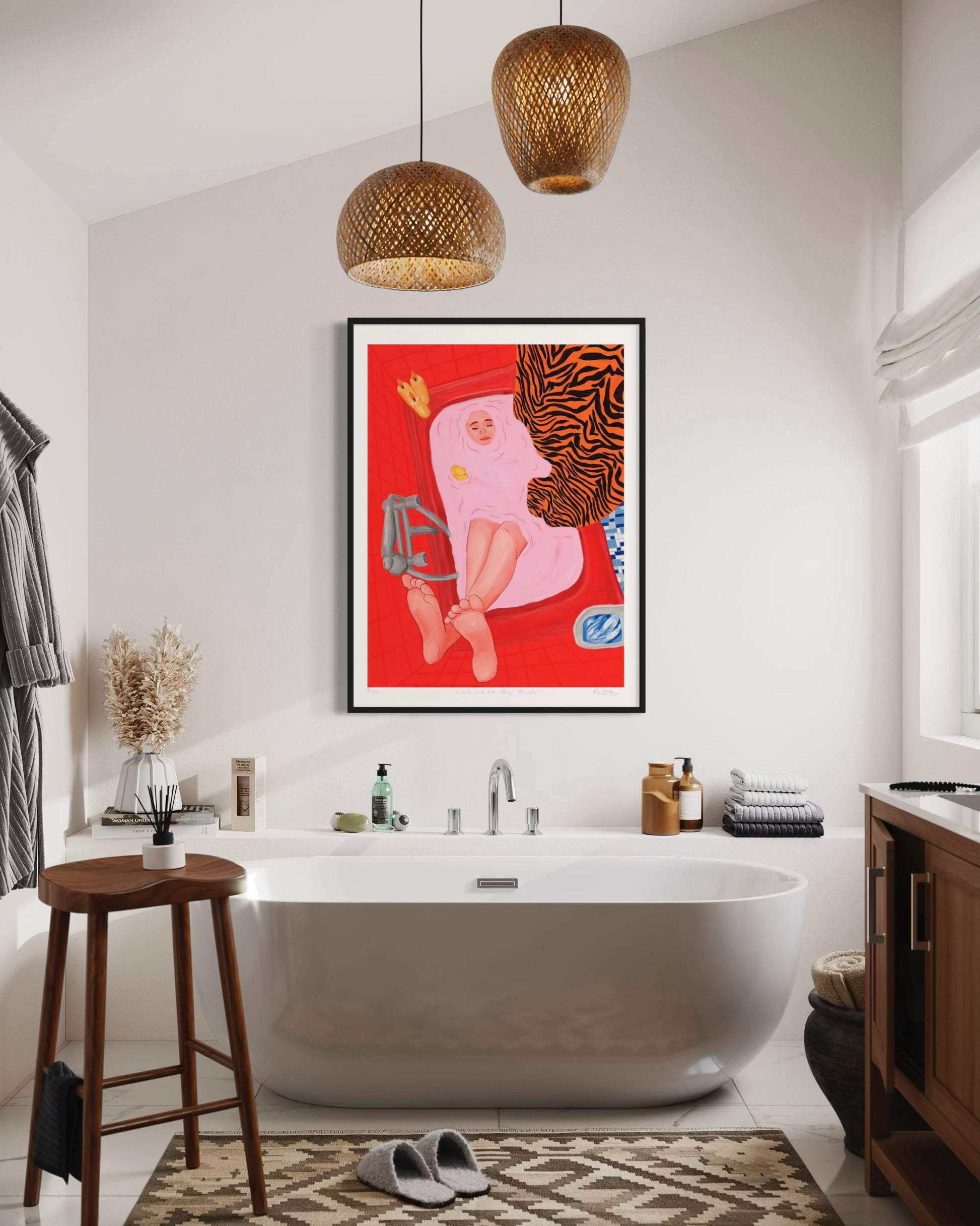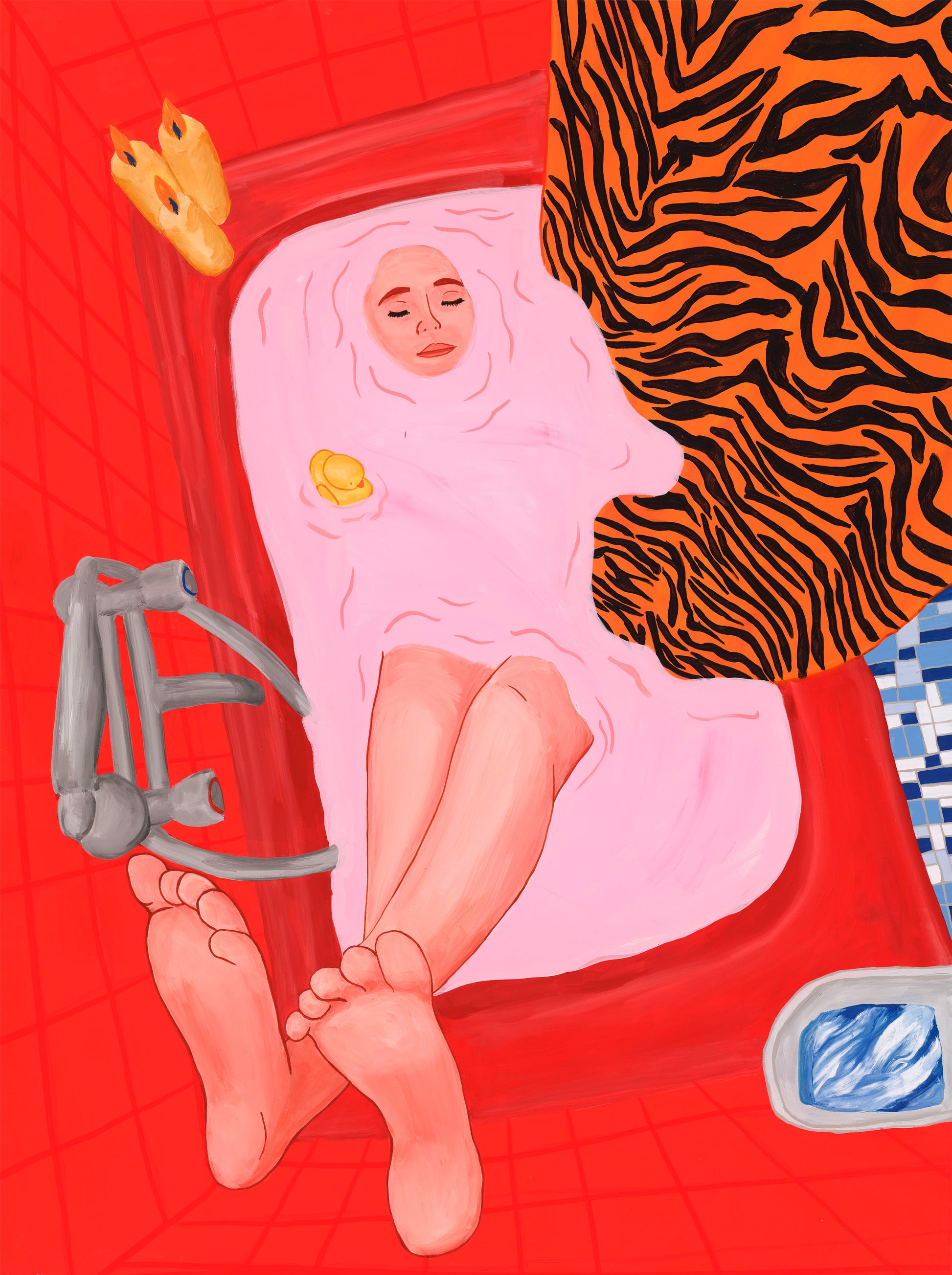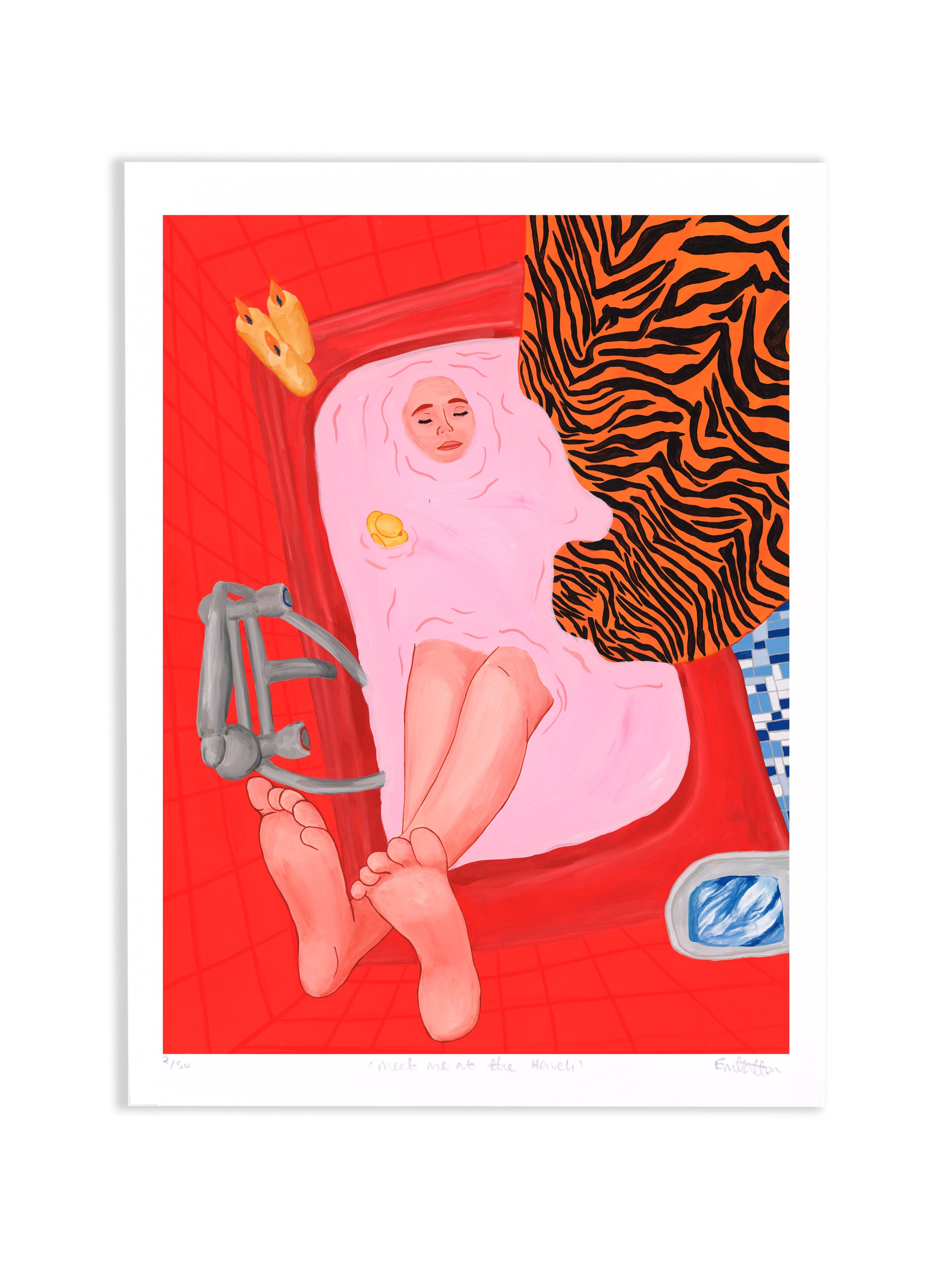 After a rough day, she sinks into the tub and the worries on her mind melt away. Submerged, she’s found peace, calm and lightness.This painting is all about quiet moments of calm and contemplation and feeling safe in your own space and the joy of not being perceived.