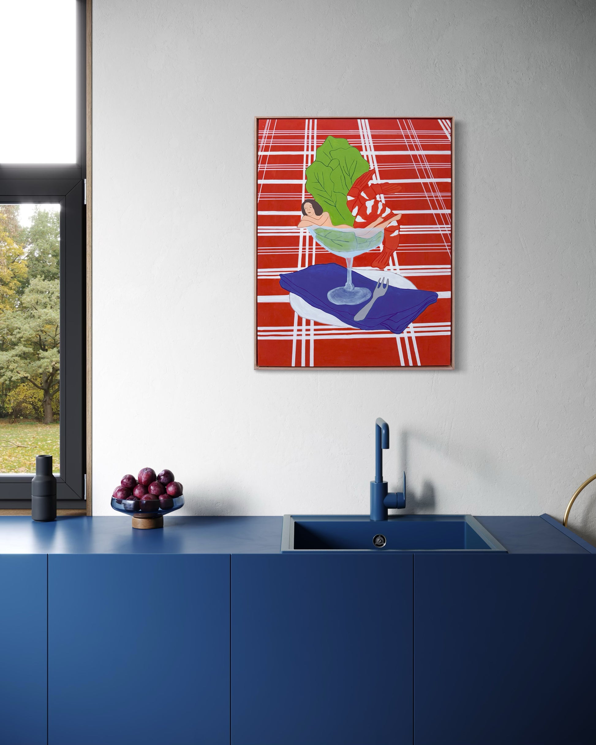 This painting is inspired by rest as protest and 'snoozing on domestic responsibilities'. Women have traditionally carried the weight of making events special, and this woman has had it, she's languidly lounging in a prawn cocktail.