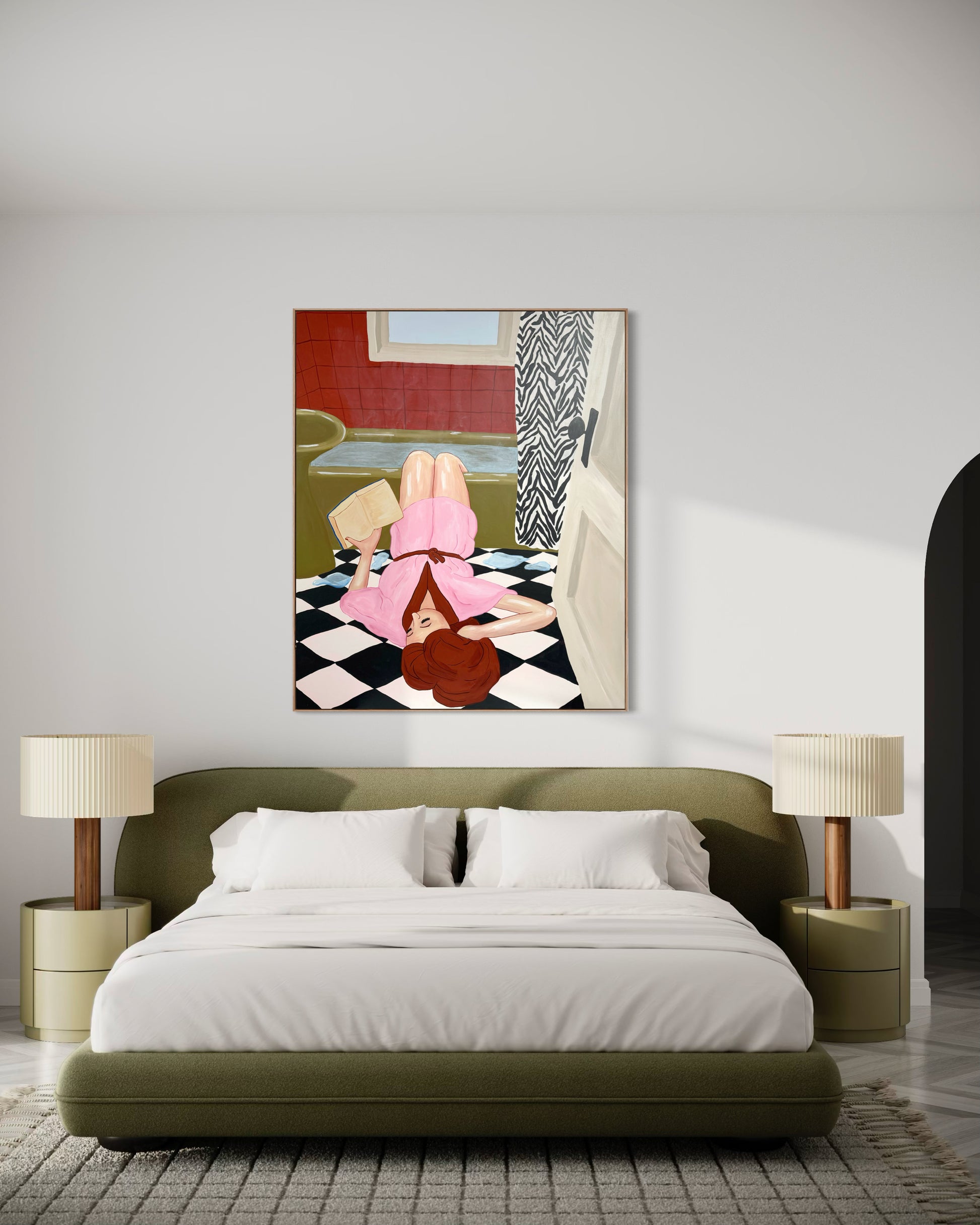 After a bath she’s on the floor feeling the force of gravity return to her body; feet in the still warm water, bundled in a robe, hair washed, reading her favourite book. Inspired by Sundays, mindful resting and 1980s green bathtubs.