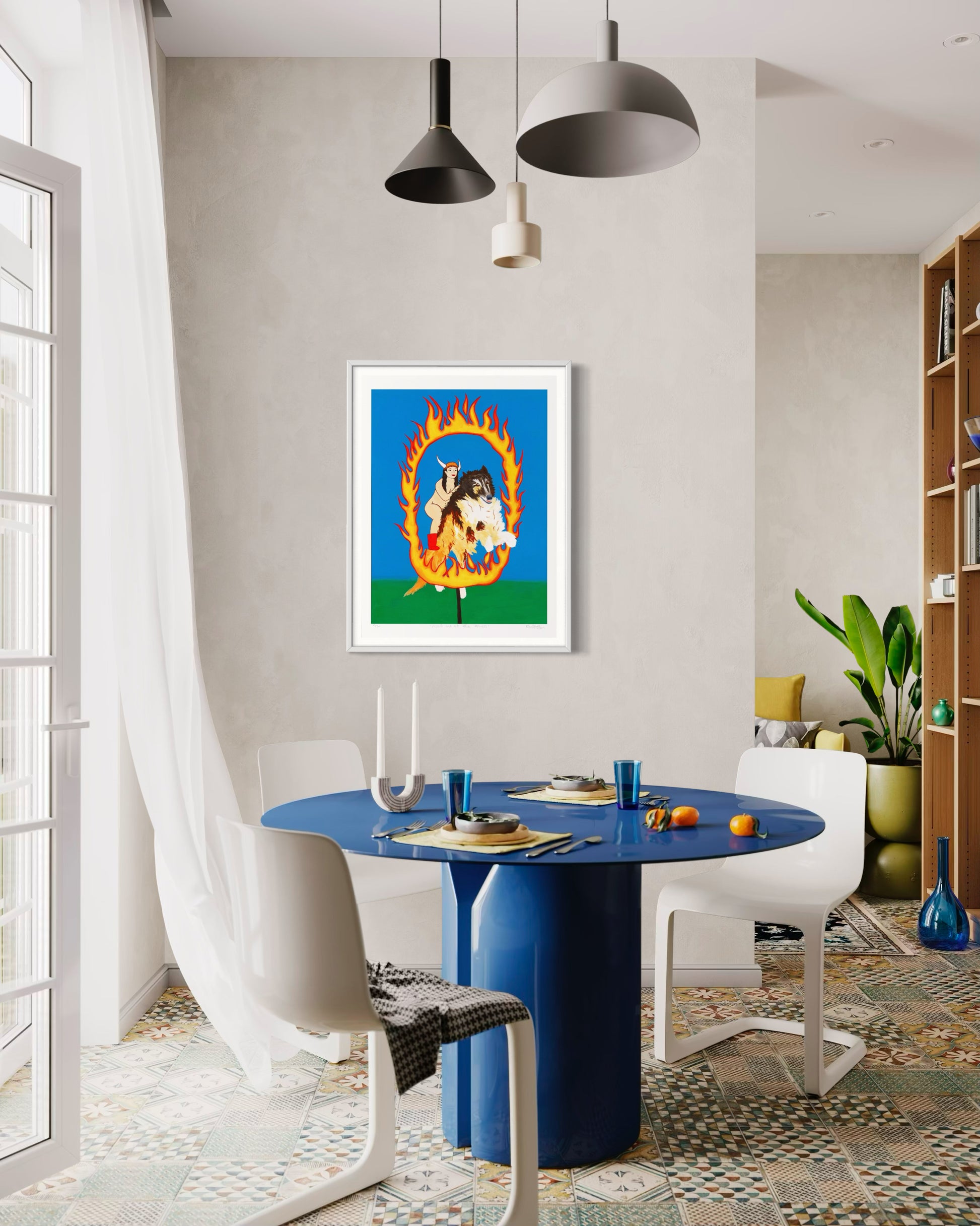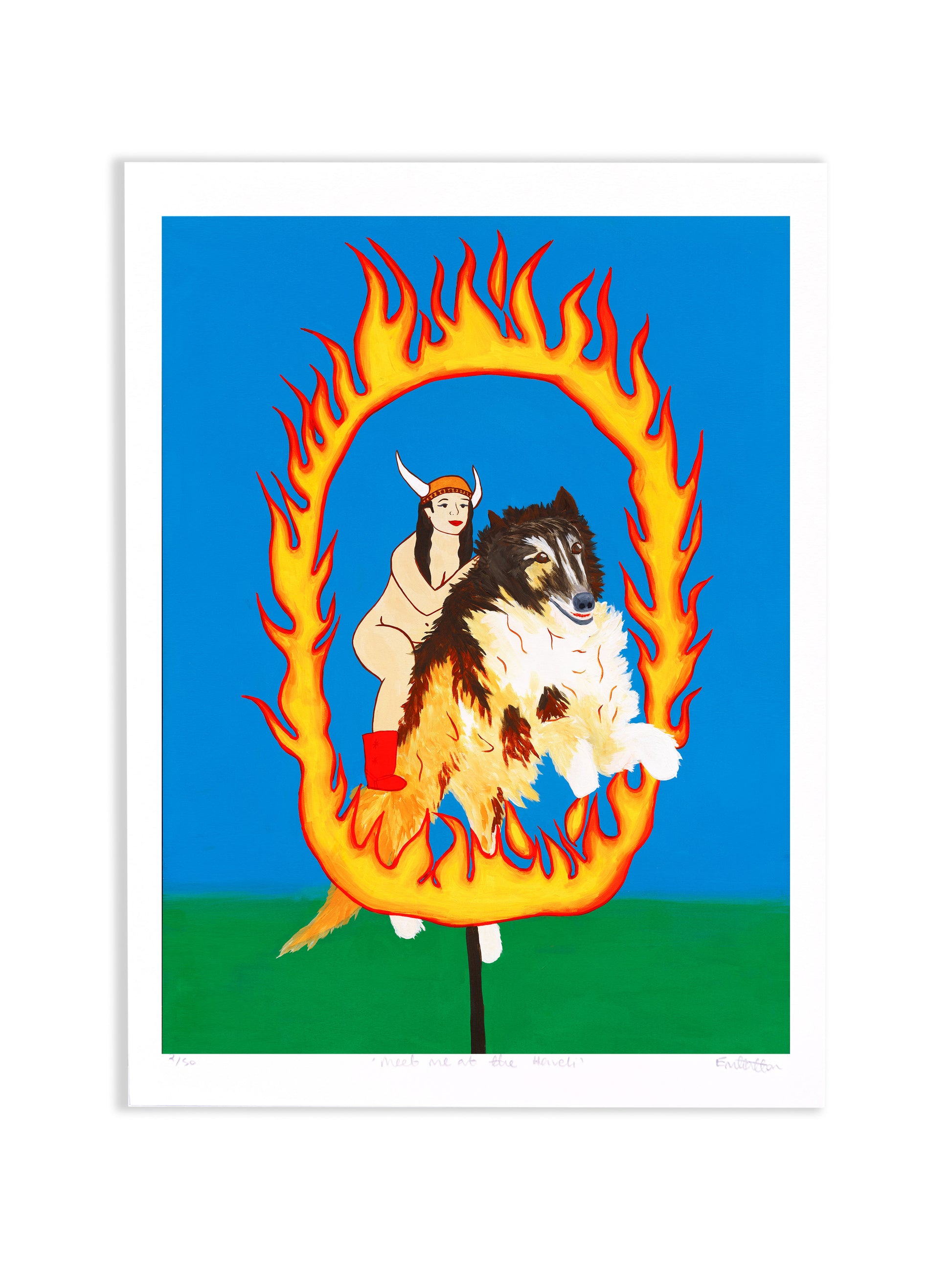 She’s riding her collie through a ring of fire, she’s best in show. Inspired by the myth of Brünnhilde, bold colour contrasts and vintage dog shows.